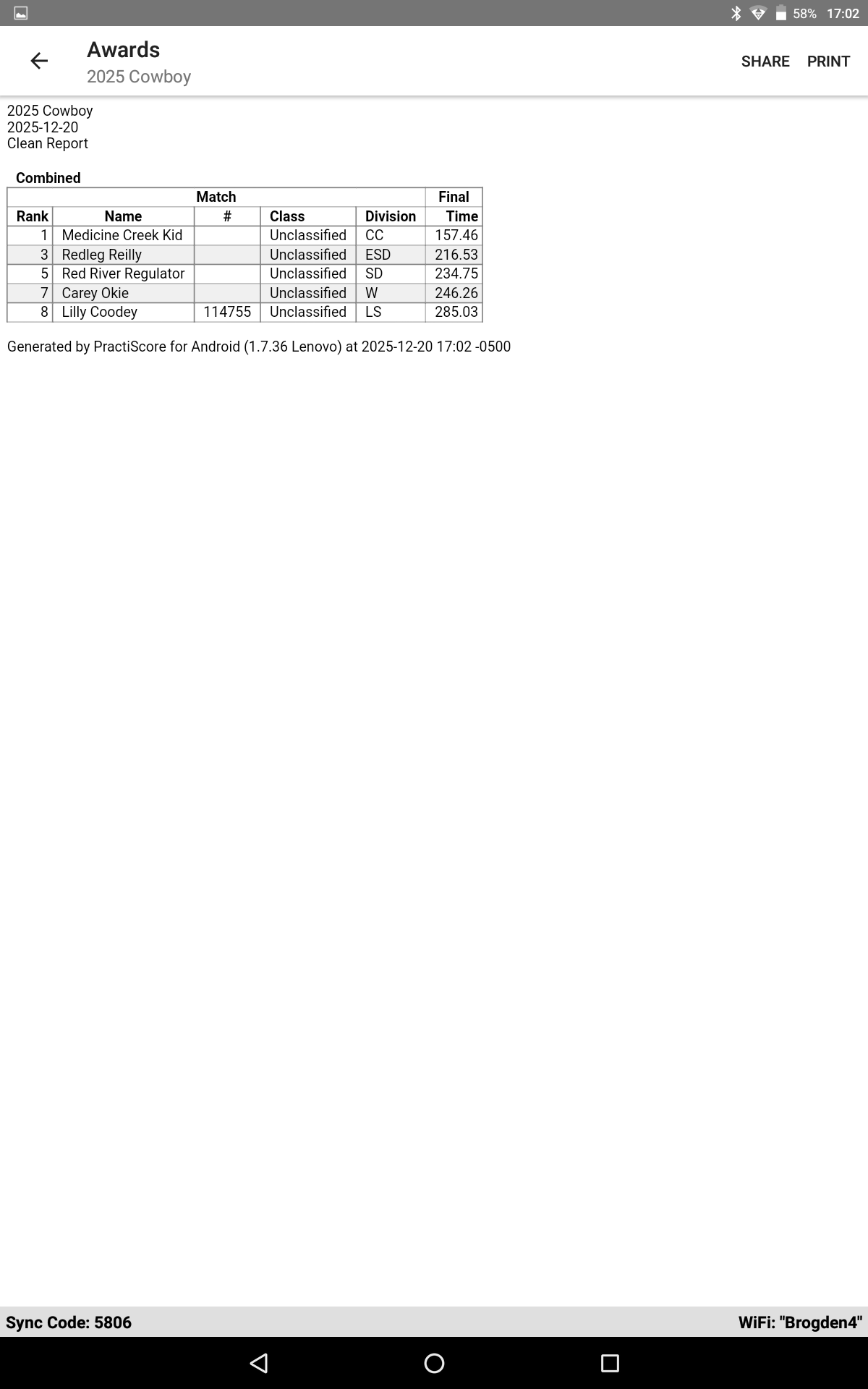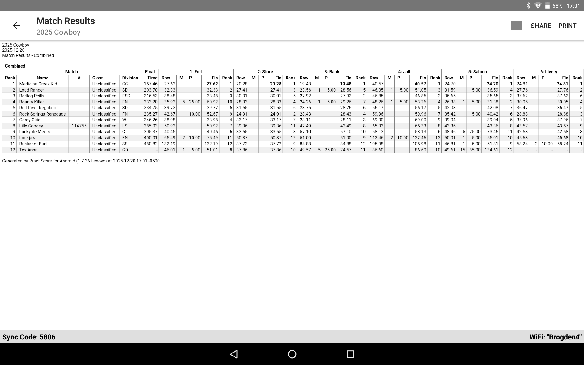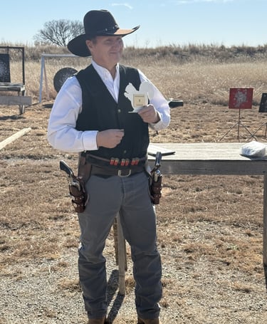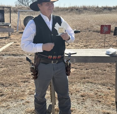 12 posse members showed up for the last match of the year and had a great day to shoot! Another AI experiment for the story as Sheriff Carey Okie attempted to clean up the Big Pasture. Exciting shooting with Bounty Killer losing all his sights, Tex-Anna deciding powder wasn't required (Black Squirrel), and RRR finally shooting his 50th clean match. Also had Logan on hand for his first cowboy match. MCK ran away with the match and we had 5 shooters clean. Hope everyone has a wonderful Christmas! Next up: 1 January match!